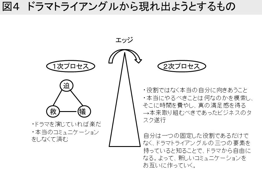一方で、ドラマを演じ続けてはいけないことは、多くの人たちが薄々は気が付いています。そこから現れ出ようとしている2次プロセスとは何でしょうか。今までは、逃げていた(避けていた)「本当の自分に向きあうこと」が始まります。また、ドラマを演じることに使っていた時間と、そこから得られる偽りの満足感が消え去ってしまいます。となると、本当にやるべきことは何なのかを模索し、そこに時間を費やし、真の満足感を得ることへのチャレンジが始まります。本来取り組むべきであったビジネスのタスク遂行が行われ始めます。営利企業においては、組織のメンバーがドラマから降りて2次プロセスを探究することの業績(売上・利益)に与えるインパクトが非常に大きいことは想像に難くありません。