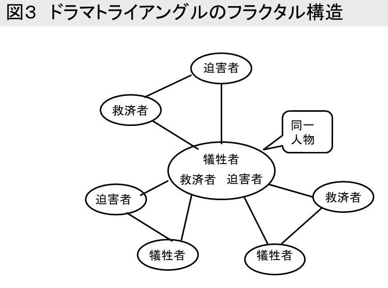 例えば、幼稚園に「いじめっ子(迫害者)」「いじめられっ子(犠牲者)」「偽りの救済者」がいたとしても、これはトライアングルが1つ存在するだけに留まります。しかし、企業組織は階層構造を持つため、トライアングルはフラクタル構造化し、より根深い問題となり得ます。
