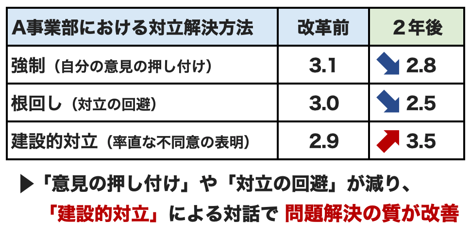 ・対立を解決する手段として「建設的対立」の形を取ることが増え、結果として問題解決の質が改善した(下図参照)