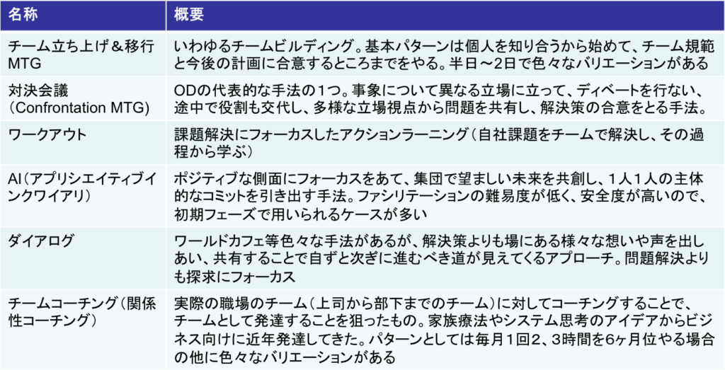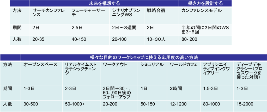 下に代表的な大グループへの介入手法を載せたが、今回はあくまでも俯瞰ということで、個々のワークショップデザインの特徴は別の機会に譲りたい。