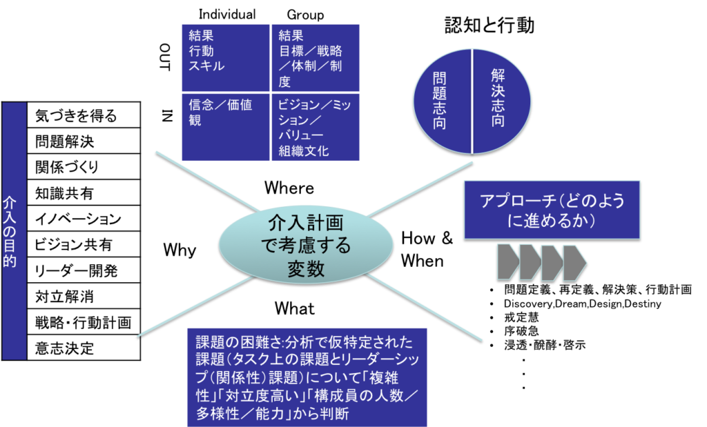 介入計画をたてるには、先ずは介入の目的を考えてから、意識的に介入手法を意識的に選択することが重要である。私の場合は図にあるような要素を考慮してプロセスを決めている。How&Whenのアプローチの部分は無数のバリエーションがあるわけだが、よく使われる介入テンプレート(例えばワークアウトやAI等)を知っておいてカスタマイズするのもよいやり方だ。