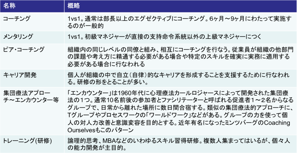 個人レベルの介入の代表例はコーチングやトレーニングなど様々な手法がある。