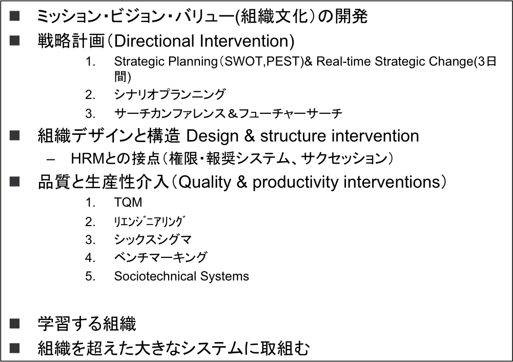 今回見てきたように、色々なODの介入手法には色々なテンプレートがあるが、比較的日本で有名なのは、AI、OST、プロジェクトアドベンチャー、アクションラーニング(質問会議:マーコードモデル)等。 でも、どれかを単発的に、又は組み合わせてやっておしまい!とはならないと私は考えている。(ツール主導主義ではODは機能しない) 組織課題は常に変化し続けるので、その現実に対して介入し、その介入で得られたフィードバックを見て、次につなげて行く。その過程を通じて、ノウハウもクライアント側に移転し、ヒトと組織の成長を高めて行く、カウンターパートとコンサルタントの関係の質も高めて行く。コンサルタントはいつまでもある役割を担い続けないよう、フェードアウトするこも大事である。