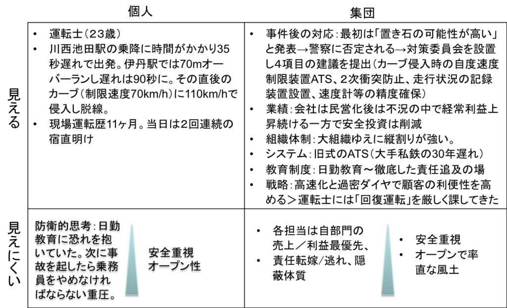 2005年に死者107名、負傷者549人を出した大規模な鉄道事故。事故を直接ひき起したのは当時23歳になる運転士であるが、組織的側面も大いに関わっていると思われる。 当時の状況を公開情報を元に米心理学者のケンウィルバー氏の統合経営モデル(氷山モデルと組織/個人を統合して考えるフレームワーク)で整理してみると図のようになる。(水面下については筆者の推測)
