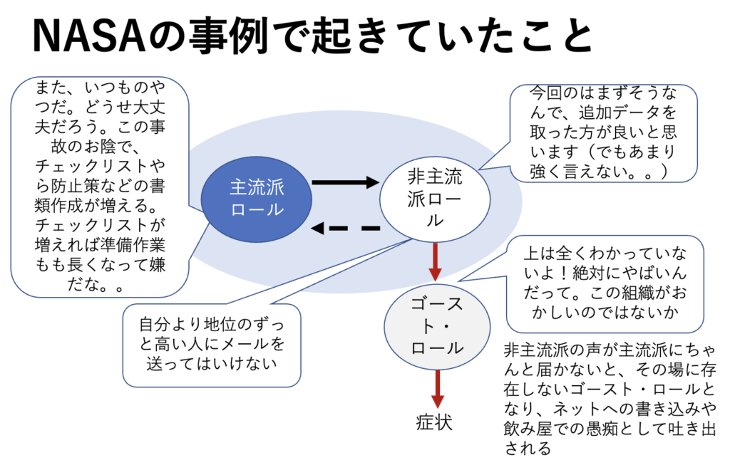 2003年2月1日、16日間の任務を終えたスペースシャトル・コロンビア号は、7人の宇宙飛行士を家族の待つ地球に届ける寸前、大気圏突入直後に機体が分解する事故となった。原因は打ち上げ時の耐熱材の機体衝突。この問題は以前の飛行でも何回か起きていた。飛行上非常に危険であるにも関わらず、これまでは大丈夫だったことからエンジニアもマネジャーも次第に慣れてしまっていた。 実際、当時のNASAでは打ち上げ時の問題に対して立ち上がった対策委員会の ハム議長は「我々に出来ることがあまりない以上、飛行中の問題として扱うべきではない」と早々に組織の中にある主流派の声を代弁して声明を出した。 しかし、現場に詳しいエンジニアチームの中では「損害を正確に査定するには追加データが必要であり。国防省の協力を得ることが重要だ」という声があり、彼らはそれを上司に申請した。しかし上司は、この非主流派の声を黙殺。怒ったメンバーは批判メールを送信した。ただし、非主流派の同僚に対して。結局、彼らの怒りの声は主流派である組織上層部には届かなかった。 この出来事の背景には”自分より地位のずっと高い人にメールを送ってはいけない”という組織の中の暗黙の前提(組織レベルではそれを組織文化という)が存在している。