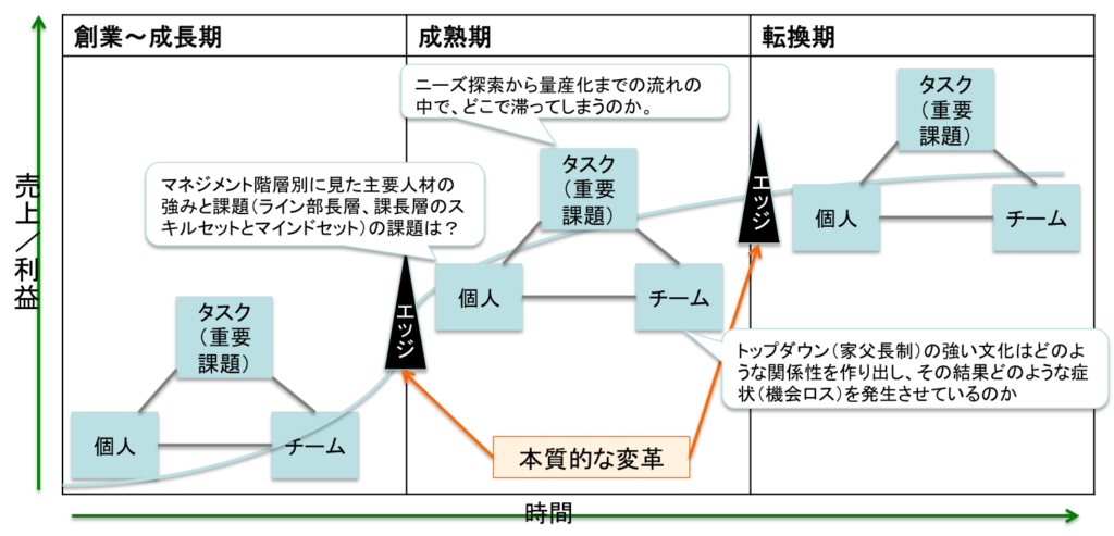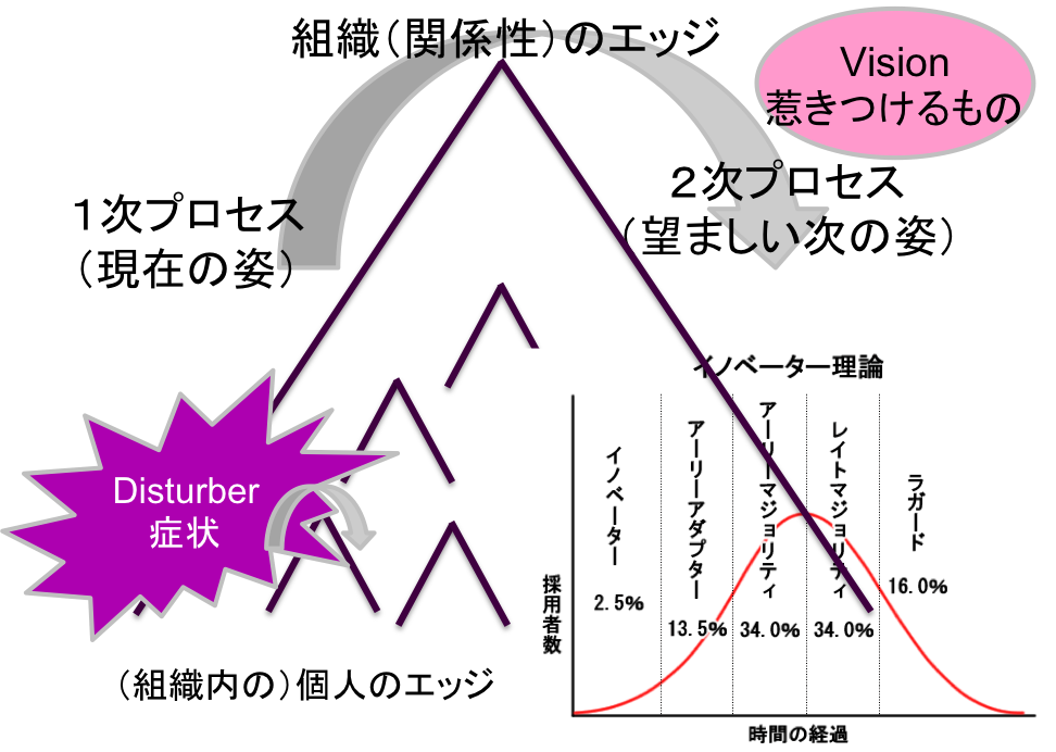 組織は一気に1次プロセスから2次プロセスには行かないので、組織の中のどことどこに、どういうエッジが存在するのか、誰を巻き込むことから始めていくのが良いのか(イノベーター理論のステークホルダー分析)を見極めながら進んでいく事が重要です。