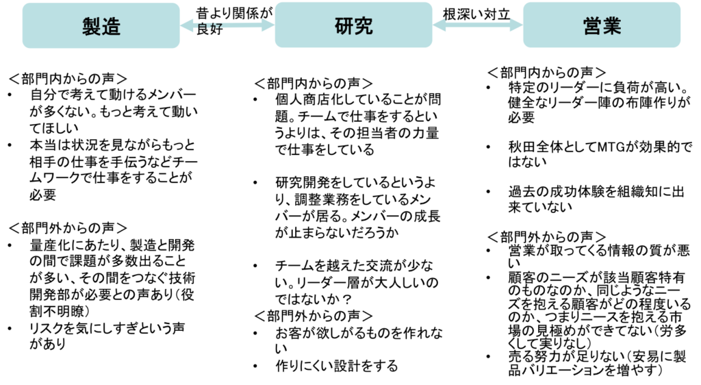 私達は組織内の主要関係者へのインタビューやサーベイを使って情報収集を行ってから組織内地勢図を作成し組織内で起きている葛藤を俯瞰することから始めます。