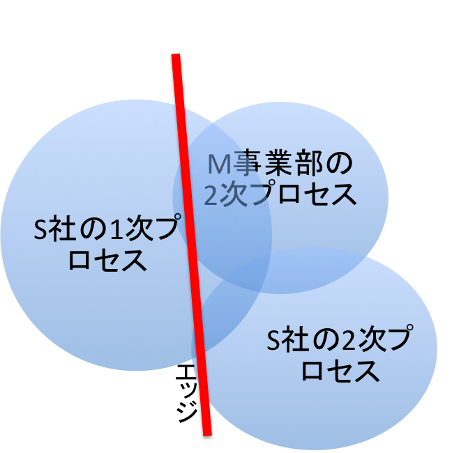 全体像をプロセスワークの視点から見立てると以下のようなことが生じている。S社の主流のアイデンティティ(1次プロセス)は、保守的、安定的であり、研究開発に注力して、大手顧客との間に利益を生み出している。しかし、M事業部は、同様の1次プロセスを有していたのだが、外部環境の変化が圧力となり(Disturber)となり、新たなアイデンティティ(2次プロセス)を創出することが要求される構造となる。しかし、1次と2次の間にはエッジが存在するので、M事業部に生じているエッジは何か、何が起きようとしているのか(起きるのが望ましいのか)を分析する必要がある。 またS社から見ると、M事業部は同社の中で異質の役割を担い始めているため、同社の2次プロセスとしても位置付けられ、このことを意識化して捉え直しておく必要があるだろう。