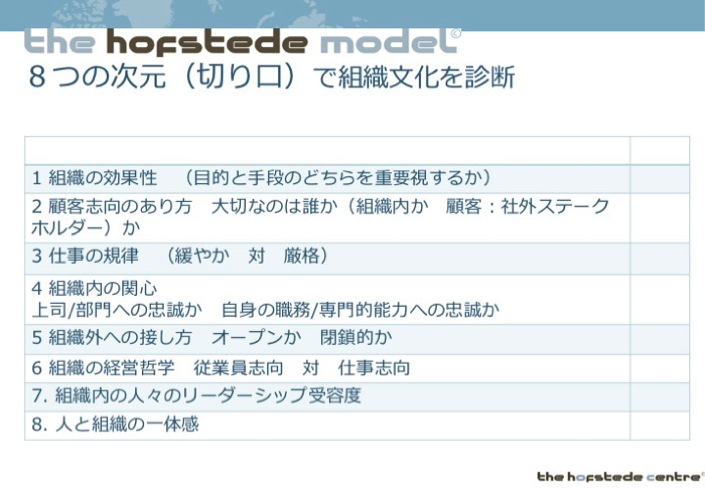 本事例においては内部OD担当者が介入し、詳細なアセスメントを行っているが、ホフステードの組織文化診断を用いることはより安定的で有効なアセスメントを実行できたのではないかと思われる。予測されるのはM事業部内の組織文化の違いであり、新たな組織文化を必要とするマーケティング部と、その他の部の違いが出るだろう。特に、製品部に現れる組織文化は本社のそれに近いはずであり、組織内で組織文化の対立が生じていることになる。