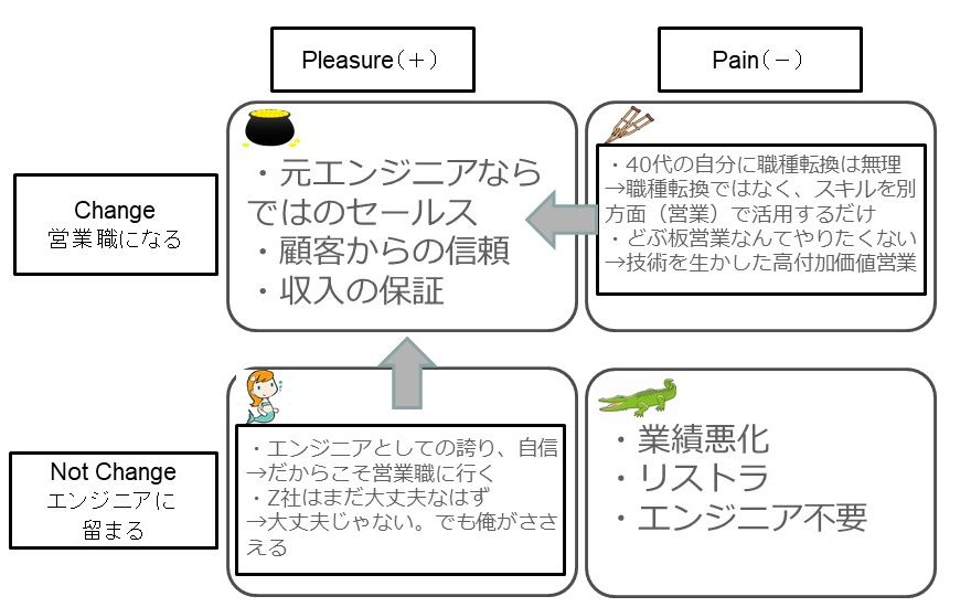 【人魚】現状のプレジャー(喜び)の最大のポイントはAさんのエンジニアとしての誇りです。長年このエンジニアとしての仕事をつきつめてきて、専門家としての自信を持っています。また、1990年代に超優良企業としての名声を謳歌していたZ社が、本当に追い込まれてはいないはずと、どこかで信じてもいます。
