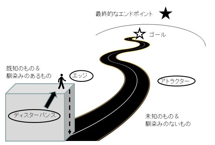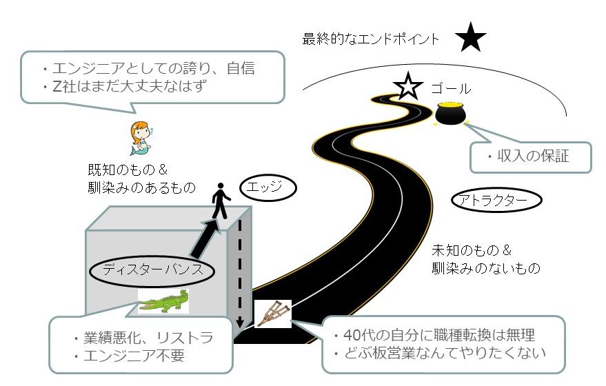 左側の高台が既知のもの、馴染みのあるものです。A氏にとってはエンジニアの仕事を意味します。そこにディスターバンス(それまでのあり方を揺さぶる妨げになるようなもの・出来事など)が起きます。A氏の勤めるZ社の業績悪化やリストラのことです。それにより、A氏はエッジ(切り立つ崖)を超えて、未知のもの&馴染みのないものへの移行を迫られます。具体的には営業職としてのA氏です。新たな領域の魅力はアトラクターと呼ばれます。A氏のケースではここが弱く、「収入の保証」にとどまっています。ゴールは営業職へと転換することですが、その先に最終的なエンドポイントが待っています。