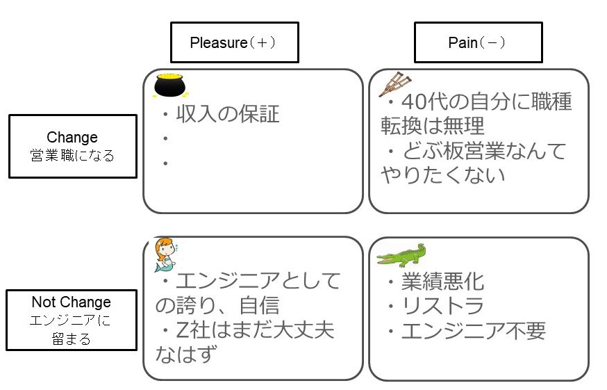 では、かつての優良IT企業Z社に勤めるエンジニアAさんの状況にペイン・プレジャー・マトリクスをあてはめてみましょう。現状はエンジニアとしてのAさん。そして今まさに人事部や上司から、営業職への職種転換という変化を迫られています。