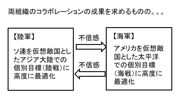 これには根深い歴史が関係しています。約40年にわたって、陸軍はソ連を仮想敵国としてアジア大陸での陸戦に、海軍はアメリカを仮想敵国として太平洋での海戦に、個別に最適化していました。よって共同作戦の際にとことんまで本音で議論して共通目的を達成しようとする日本軍全体としての組織文化が欠如し、むしろ互いへの不信感が増幅していったのでした。