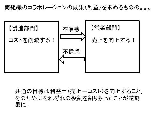 本来であれば、同じ会社での最終目標、すなわち利益の向上に向けて協力し合う2つの組織のはずなのです。利益は売上からコストを引いたもの。営業部門は売上の向上に努力し、製造部門はコストの低減にまい進する。その結果会社の業績(利益)は向上するはずです。