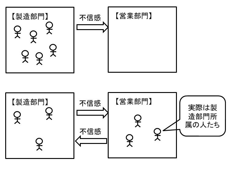 我々の組織開発コンサルタントしての経験上、上記と全く同じ構造が現代の企業組織にも多く存在します。典型的なのは、製造業の会社の、製造部門と営業部門のコンフリクトです。