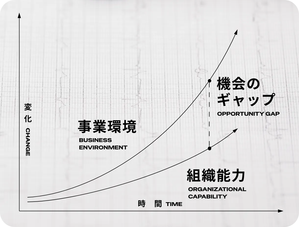 多くの企業が直面している課題は、事業環境の大きな変化の中で、組織能力の変化が追いついていないことです。私たちは、この機会ギャップこそがリーダーと組織を成長させる絶好のフィールドと考えています。